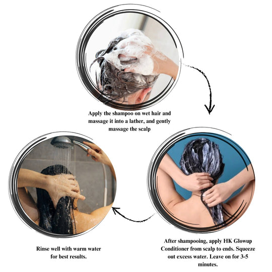 Step 2 - Use HK Glowup Conditioner from the scalp to the ends of the hair after shampooing. Gently squeeze out any extra water.