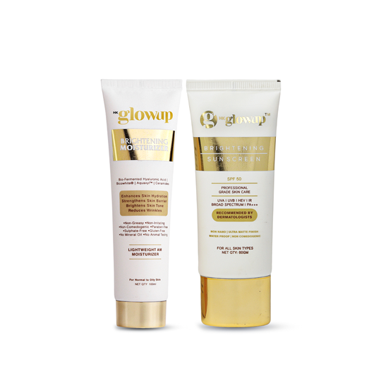 Transform your daily skincare regimen with the powerful combination of HK Glowup Brightening Moisturizer and HK Brightening Sunscreen SPF-50. The moisturizer brightens skin tone, reduces wrinkles, and provides intense hydration with ingredients like Bicowhite and Bio-Fermented Hyaluronic Acid. Meanwhile, the sunscreen offers broad-spectrum protection, a matte finish suitable for all skin types, and skin-brightening benefits from Carrot Seed Oil and Avocado Oil. These two products work in harmony to enhance your natural glow while shielding your skin from environmental damage.