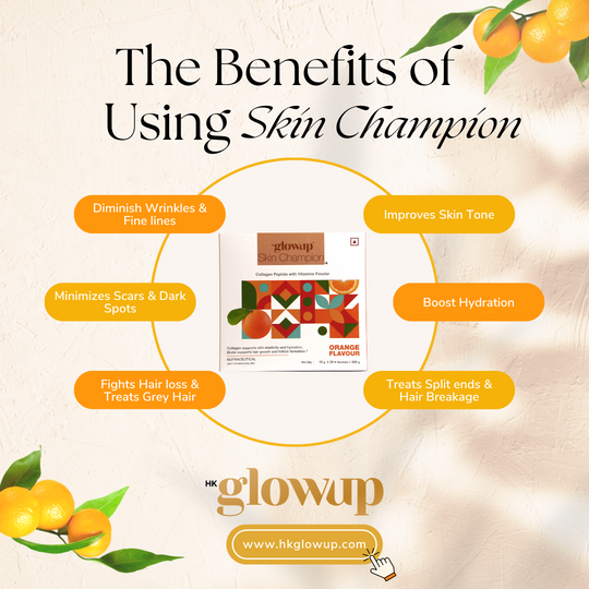 HK GLOWUP Skin Champion is a comprehensive formula for keeping your skin healthy, young, and radiant. Along with the multiple Vitamins and Biotin, HK Skin Champion Collagen Peptide powder help improve the firmness and elasticity of the skin and boosts hydration to keep skin soft and smooth. Potent antioxidants like Vitamin C help control free radical-induced skin damage and improve skin glow. Biotin, one of the critical ingredients of HK Skin Champion, helps maintain hair health and boost follicle formation as it plays a significant role in keratin protein synthesis.